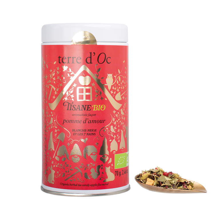Een romantische kruidenthee waarin de appel centraal staat, omhuld door de zachtheid van honeybush en zoete accenten van karamel en vanille. Een eerbetoon aan het klassieke sprookje en aan de verleiding van de betoverde appel.