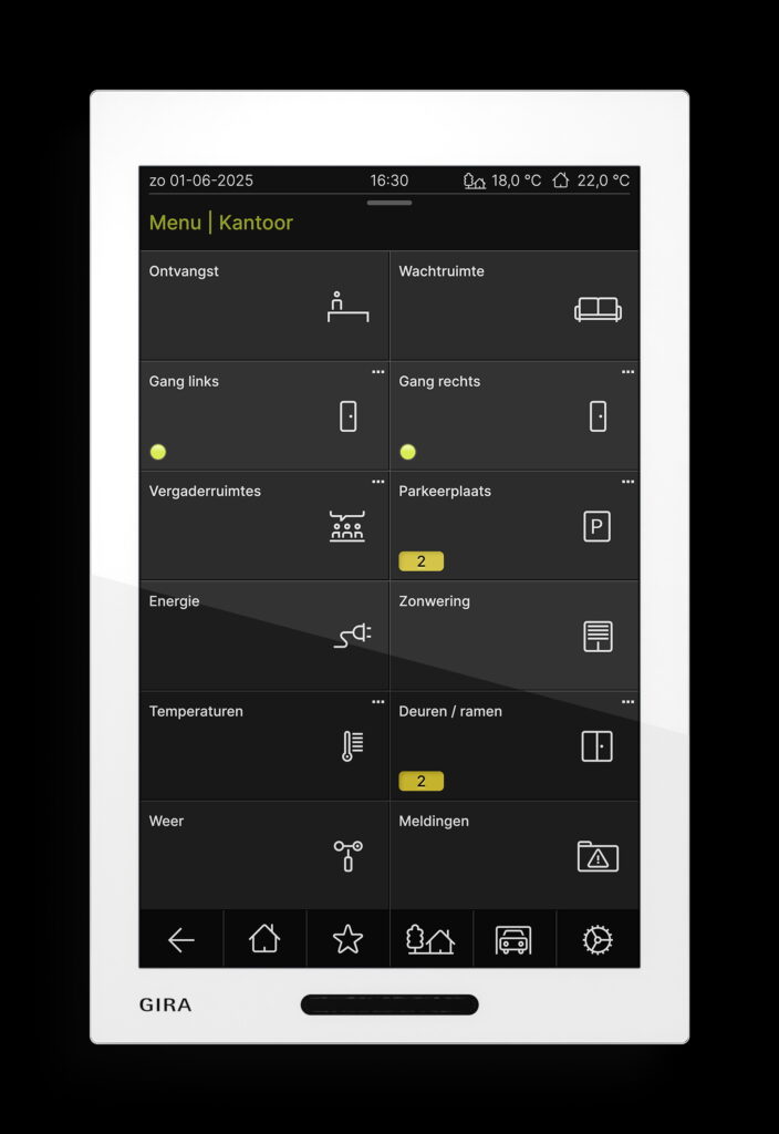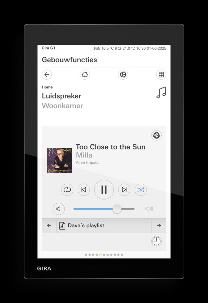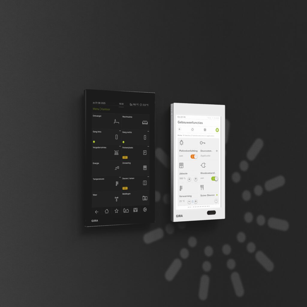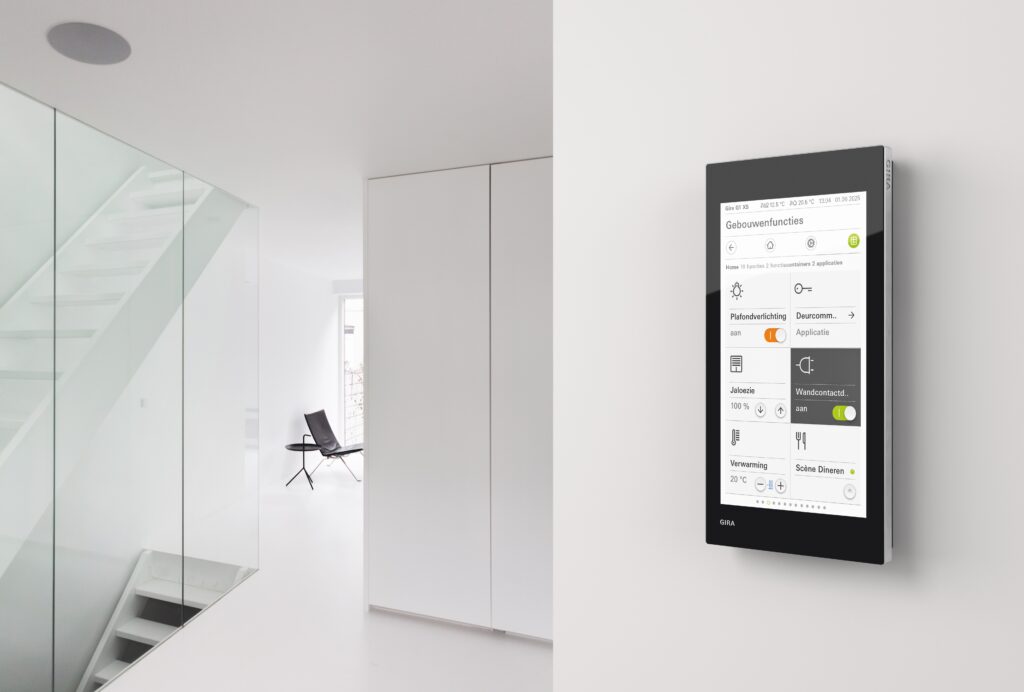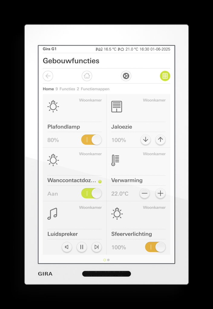 De nieuwe Gira G1 2e generatie is de slimme alles-in-één bediening voor elke woning. Via het heldere touchdisplay worden verlichting, zonwering, verwarming, muziek en deurcommunicatie eenvoudig geregeld.