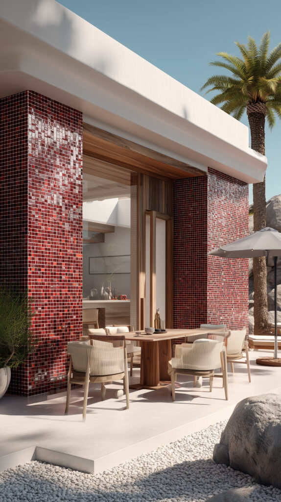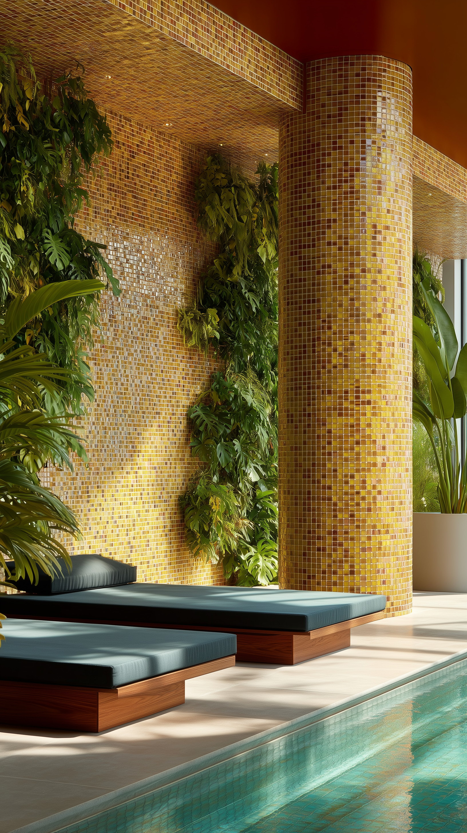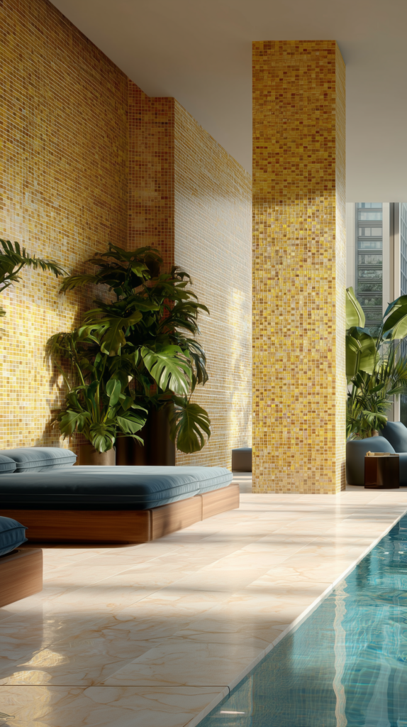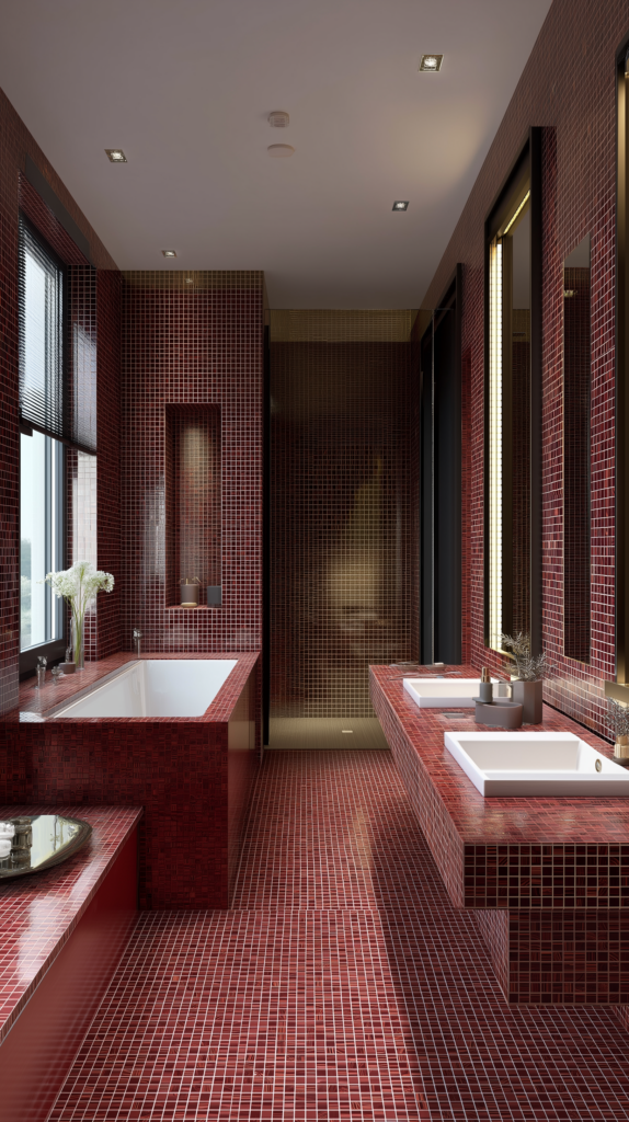 Diepe, warme tinten en subtiele metallic accenten vormen samen het intense palet. Elk tegeltje heeft een zachte glasglans met een gouden ondertoon, waardoor het licht op een unieke manier wordt gevangen en weerkaatst. Het resultaat is een mozaïek dat zowel elegant als expressief oogt, perfect voor badkamers, keukens of opvallende wanddetails in bijvoorbeeld hospitality-projecten.
